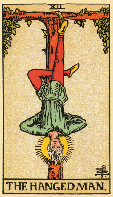 Por que é assim? Dizer a outros que se tem de pendurar-se em uma árvore é simples. Ninguém quer pendurar-se a si mesmo. Ainda que na sua posição incômoda, com frequência é representado sorrindo e com um halo dourado em torno da cabeça para mostrar a inspiração e o poder divino. É totalmente vulnerável ao mundo e a nossa vulnerabilidade encontrou a força. O sacrifício que fez foi sua liberdade e seu poder no mundo físico; em troca, se lhe outorgou liberdade e poder reais no plano espiritual. Abandonou suas antigas formas de pesquisa e agora é o afortunado possuidor de novos olhos. Mas claro que nem todos os sacrifícios têm que ser como este; ao decidir comer com um amigo em vez de comer só, sacrifica sua solidão. Se escolher praticar um esporte de forma profissional, significa que não pode praticar outro com a mesma frequência. Ao optar por um trabalho, sacrifica qualquer desejo de outro, ao menos no momento. O único traço comum a todos os sacrifícios é que se renuncia a algo que tem em troca de algo que quer, de igual ou maior valor. Sendo a carta do paradoxo, ela também o exorta para ver as coisas de uma maneira nova e diferente. Se sua mente lhe grita que faça algo, não fazer nada poderia ser o melhor. Se algo tem importância emocional para você, mas sem nenhum propósito, talvez seja melhor pensar antes de executá-lo. Não trate de forçar as coisas para que algo aconteça enquanto esta carta estiver por perto. Ao procurar força-las estará assegurando que nunca aconteçam. Relaxe e deixe que as coisas aconteçam, em vez de tratar de interferir. Em lugar de lutar contra a corrente, deixe que o leve com ela.